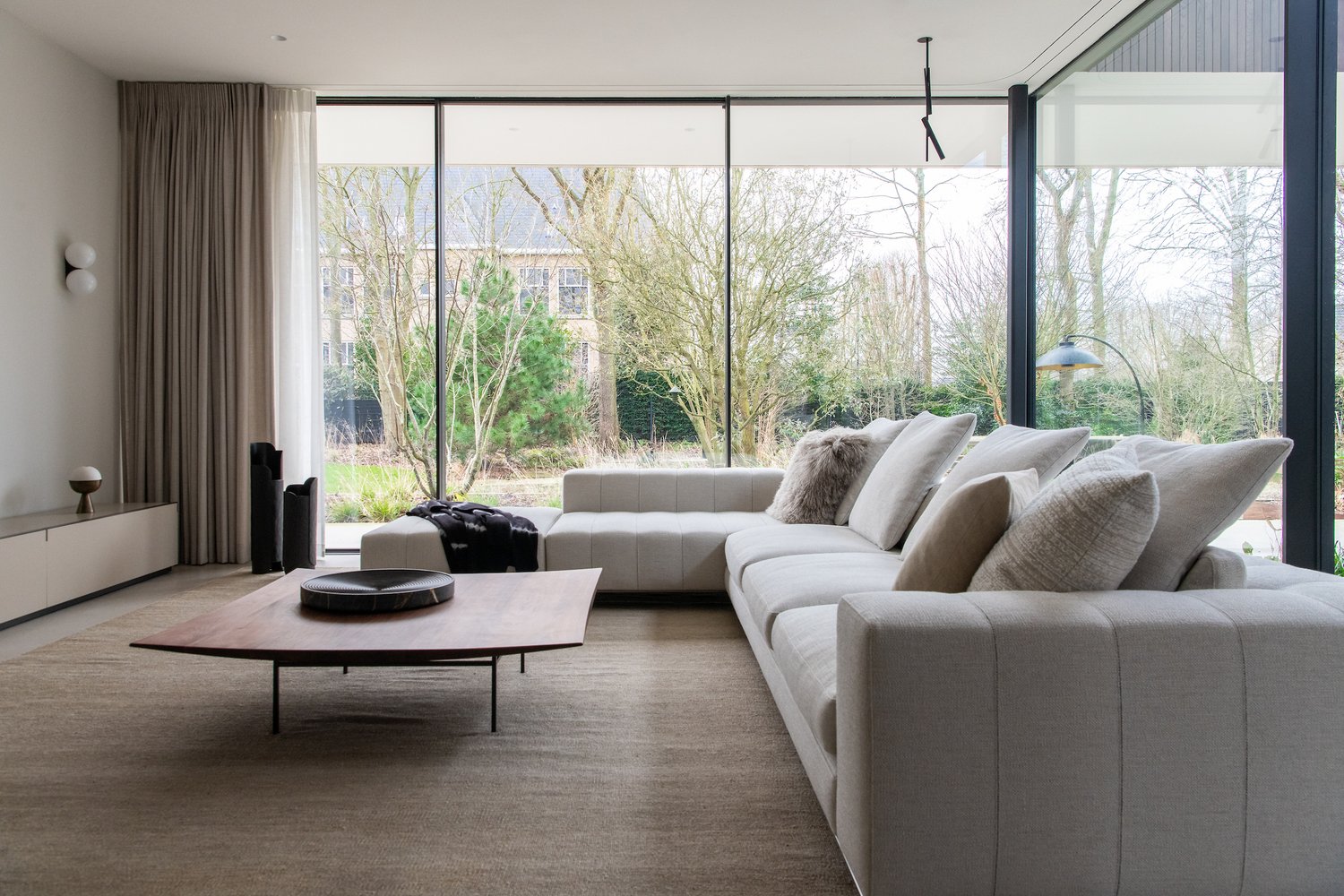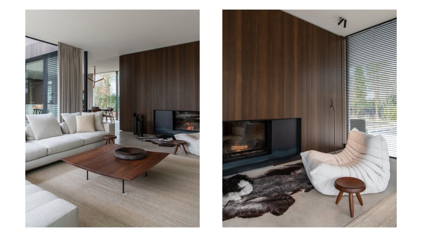 The living space centers around a minimalist fireplace wall clad in dark wood. Comfort and sculptural form meet in a generous modular sofa and an iconic lounge chair. The color scheme—sand, beige, charcoal, and walnut—is grounded yet layered, enhanced by subtle contrasts in black and marble.