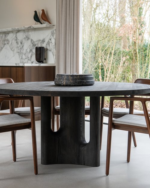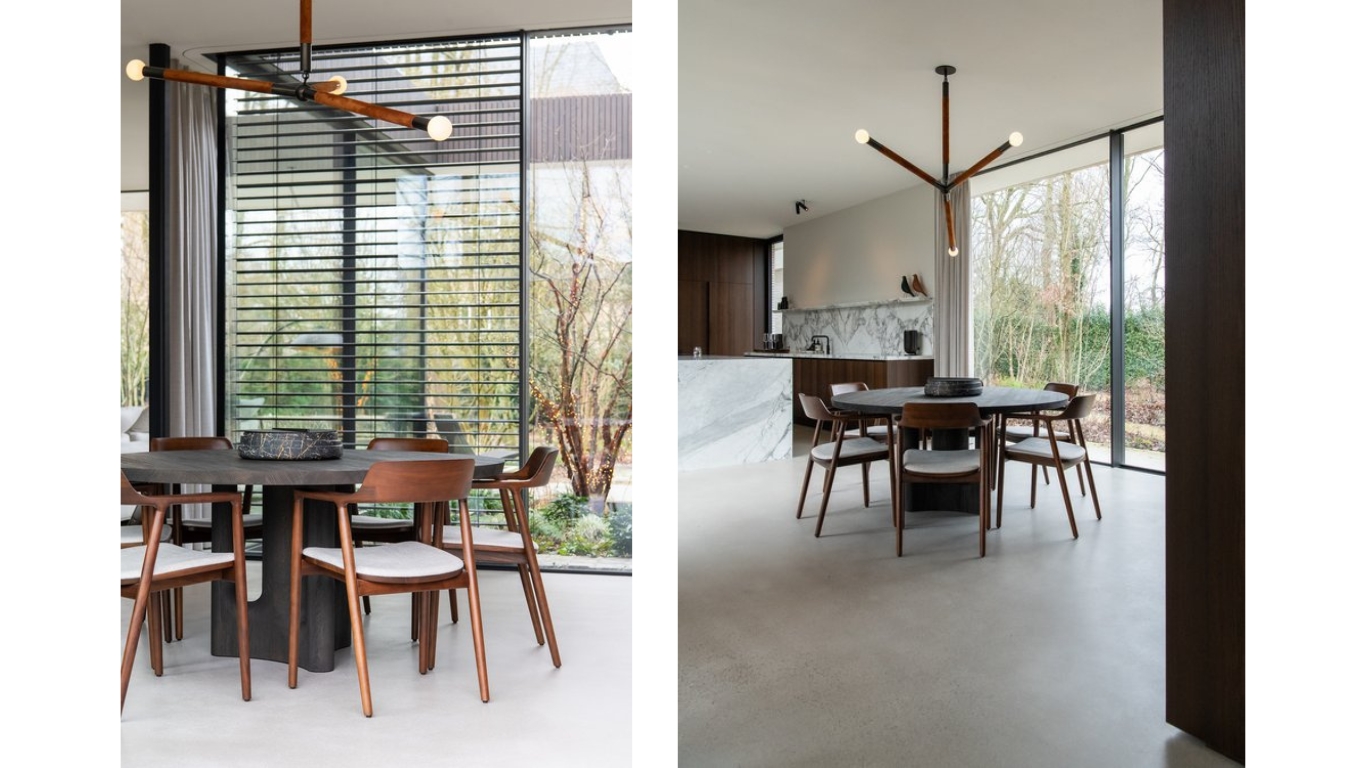 The dining area gently transitions between the kitchen and the outdoors. Rounded shapes, fine wood finishes, and a striking light fixture give this space a sense of architectural presence without losing warmth.