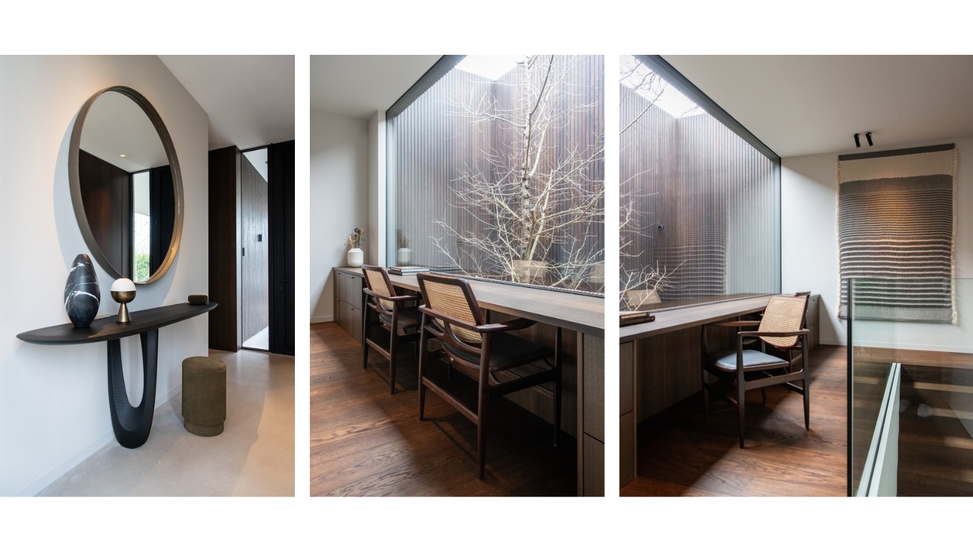 In the workspace, custom cabinetry, dark wooden floors, and woven cane accents create a timeless ambiance—perfect for focused moments with a view of the private courtyard.